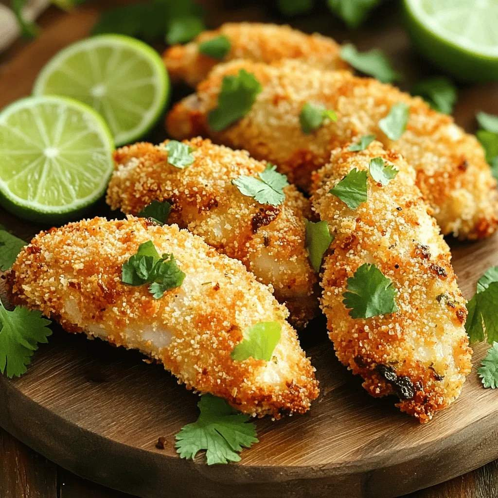 For this dish, you need the following items: - 1 lb chicken tenderloins - Juice of 2 fresh limes - Zest of 1 lime - 1 tablespoon extra virgin olive oil - Salt and freshly ground black pepper to taste The chicken tenderloins are key for their tender and juicy bite. The lime juice adds a bright tang, while the zest gives it a punch. Olive oil helps keep the chicken moist. The spice blend kicks up the flavor. Here’s what you need: - 2 tablespoons chili powder - 1 teaspoon garlic powder - 1 teaspoon onion powder - 1 teaspoon paprika - 1 teaspoon ground cumin This mix brings warmth and depth to your chicken. Chili powder adds heat, while garlic and onion powders give a savory touch. Paprika brings color, and cumin adds an earthy note. For that crispy outside, gather these ingredients: - 1 cup breadcrumbs (panko is best for crunch) - Fresh cilantro leaves for garnishing - Lime wedges for serving The breadcrumbs provide the crunch you want. Panko is lighter and crisps up well. Cilantro adds freshness, and lime wedges enhance the zesty flavor at serving. This combination makes the air fryer chili lime chicken tenders a juicy delight. To start, gather your spices. In a large bowl, mix together: - 2 tablespoons chili powder - 1 teaspoon garlic powder - 1 teaspoon onion powder - 1 teaspoon paprika - 1 teaspoon ground cumin - Salt and freshly ground black pepper to taste Stir these spices well. This mix will give your chicken a bold, zesty flavor. Make sure every spice blends evenly. Next, add 1 pound of chicken tenderloins to the spice mix. Toss the chicken until every piece gets coated. This step is important for flavor. Now, squeeze the juice of 2 fresh limes over the chicken. Add the zest of 1 lime and 1 tablespoon of olive oil. Mix everything together well. Let the chicken marinate for at least 15 to 20 minutes. This allows the flavors to soak into the meat. Preheating the Air Fryer Before cooking, preheat your air fryer to 400°F (200°C). This usually takes about 5 minutes. Preheating helps achieve that crispy texture we all love. Coating the Chicken with Breadcrumbs While the air fryer heats up, prepare 1 cup of breadcrumbs in a shallow dish. After marinating, take the chicken out of the bowl. Dip each tender into the breadcrumbs. Press gently so they coat evenly. Cooking Time and Temperature Settings Once preheated, place the chicken tenders in the fryer basket in a single layer. If you have many tenders, cook them in batches. Air fry for 10 to 12 minutes. Flip them halfway through cooking. The tenders should turn golden brown and reach an internal temperature of 165°F (74°C). After cooking, let the chicken rest for a few minutes. This keeps them juicy. Serve with fresh cilantro and lime wedges for a zesty touch! To get the best flavor, marinate the chicken for at least 20 minutes. The longer you let it sit, the better the taste. Use fresh lime juice and zest for real flavor. This gives the chicken a bright, zesty kick. Always make sure every piece of chicken is coated well in the marinade. You can even marinate overnight for a deeper flavor! For that perfect crunch, use panko breadcrumbs. They are lighter and crispier than regular breadcrumbs. Before coating the chicken, make sure it's dry. This helps the breadcrumbs stick better. When you air fry, do not overcrowd the basket. This allows hot air to circulate and creates a crispy crust. Flip the chicken halfway through cooking to ensure even crispiness. One common mistake is not preheating the air fryer. This step is key for a crispy texture. Also, avoid skipping the marination step. It makes a big difference in flavor. Do not use too much oil when coating the chicken. A light drizzle is enough. Finally, ensure the chicken reaches an internal temperature of 165°F to keep it safe and juicy. {{image_4}} If you want more heat, try using cayenne pepper instead of chili powder. It adds a nice kick. You can also mix in chipotle powder for a smoky flavor. Just start with a small amount, then add more to taste. Want to change the taste? Use herbs like oregano or thyme. They can add new layers of flavor. You can also add some honey for sweetness or soy sauce for a savory twist. Each option gives a unique spin on the dish. If you need a gluten-free choice, use crushed gluten-free crackers. They work well and offer a nice crunch. You can also use almond flour or cornmeal as an alternative. Both options help keep the tenders crispy while fitting your dietary needs. To store leftover chicken tenders, place them in an airtight container. Make sure to let them cool down first. You can keep them in the fridge for up to three days. If you want to keep them longer, consider freezing them. When you reheat your chicken tenders, use the air fryer. Set it to 350°F (175°C) for about 5-6 minutes. This method helps keep the chicken crispy. You can also use the oven. Just cover them with foil and bake at 350°F (175°C) for around 10-15 minutes. Avoid using the microwave as it can make them soggy. For long-term storage, freeze the chicken tenders. First, let them cool completely. Then, wrap each piece in plastic wrap. Place the wrapped tenders in a freezer bag. They can last for up to three months in the freezer. To use, thaw them in the fridge overnight before reheating. To keep the chicken tenders juicy, marinate them well. Use lime juice and zest for flavor. Allow them to soak for at least 15-20 minutes. This helps the chicken absorb moisture and spices. Cooking them in the air fryer at 400°F (200°C) also seals in juices, giving you a tender bite. Yes, you can use chicken breasts. Slice them into strips about the size of tenders. This will help them cook evenly. Remember, they may take a bit longer to cook. Check the internal temperature to reach 165°F (74°C) for safe eating. The flavor will still shine through! A few great options include: - Avocado ranch: Creamy and cool. - Chipotle mayo: Adds a nice kick. - Honey mustard: Sweet and tangy. - Salsa: 