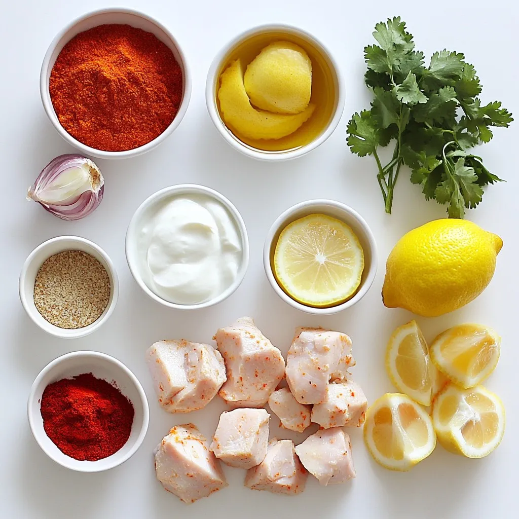 – First, gather your ingredients for the marinade. In a bowl, mix one cup of plain yogurt, two tablespoons of lemon juice, two teaspoons of garam masala, one teaspoon of ground cumin, one teaspoon of turmeric, and one teaspoon of sweet paprika. Add a pinch of salt to taste.