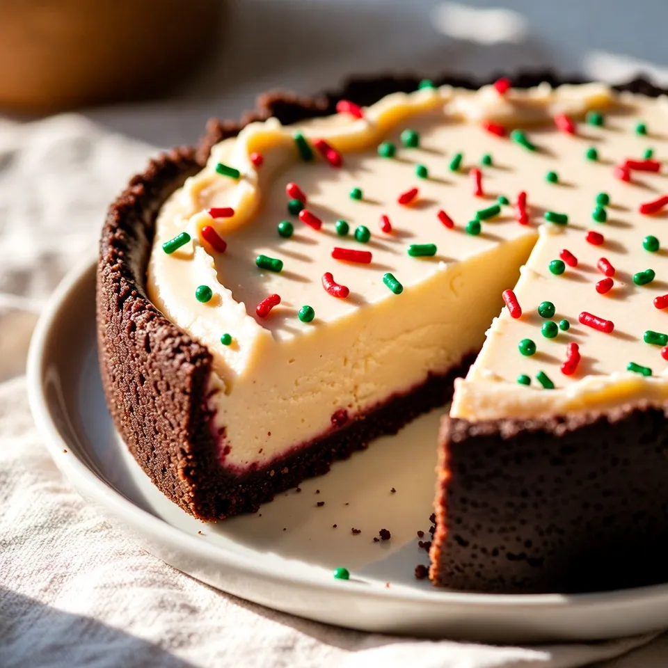 A festive cheesecake with a red velvet twist, topped with cream cheese frosting and decorated with sprinkles.