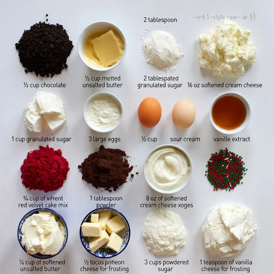 To make this cheesecake, gather all these ingredients first. The crust holds the cheesecake together, giving it a rich chocolate flavor. The filling is creamy and smooth, with the red velvet cake mix adding a nice touch. Finally, the cream cheese frosting adds sweetness and a festive look. Each part plays a key role in creating a delicious dessert that everyone will enjoy.