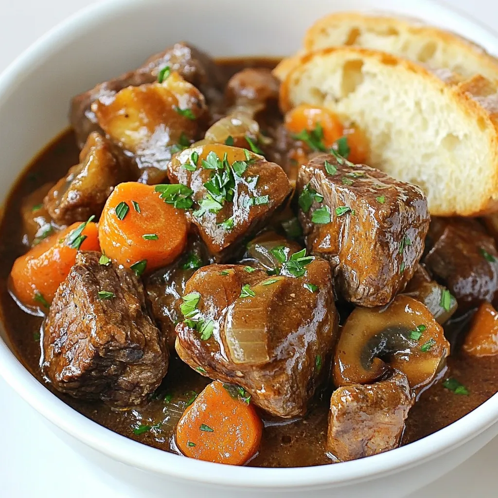 - 2 pounds beef chuck, cut into 1-inch cubes - 4 slices of thick-cut bacon, chopped (omit if avoiding pork entirely) - 2 cups beef broth - 1 large onion, finely chopped - 2 carrots, sliced into rounds - 2 cloves garlic, minced - Fresh parsley, finely chopped (for garnish) - 1 tablespoon tomato paste - 1 teaspoon dried thyme - 8 ounces cremini mushrooms, quartered When making Beef Bourguignon, choose quality ingredients for the best flavor. The beef chuck is key. It becomes tender and juicy during cooking. The thick-cut bacon adds a rich, smoky taste, but feel free to skip it if you prefer a pork-free dish. The beef broth enhances the depth of flavor. Use homemade or store-bought broth, but I recommend low-sodium options for better control over salinity. Fresh vegetables bring brightness to the dish. The onion and carrots soften and sweeten as they cook. Garlic adds an aromatic touch. Lastly, don’t forget the mushrooms. They add texture and earthiness to the stew. With these ingredients, you create a warming, hearty dish full of flavor. {{ingredient_image_2}} First, heat olive oil in a large Dutch oven. Use medium-high heat. Once the oil shimmers, add chopped bacon. Cook until crispy. Then, use a slotted spoon to take it out. Let it drain on paper towels. If you want a pork-free dish, skip this step. Next, season the beef cubes with salt and pepper. In batches, place them in the hot pot. Sear the beef until browned on all sides, about 4-5 minutes. Remove the browned beef and set it aside. In the same pot, add the chopped onion and sliced carrots. Sauté them for about 5-6 minutes. The vegetables should soften and smell great. Now, stir in the minced garlic. Cook for one more minute until it gets fragrant. Next, add the tomato paste and sprinkle flour over the mixture. Stir well to mix. Cook for one minute to get rid of the raw flour taste. Gradually pour in the beef broth. Use a wooden spoon to scrape any brown bits from the bottom of the pot. This adds a lot of flavor. Return the browned beef to the pot. Add thyme, bay leaves, and the crispy bacon if you used it. Bring the mixture to a gentle simmer. Cover the pot with a lid. Reduce the heat to low. Let the beef bourguignon cook gently for about 1.5 to 2 hours. The beef should become tender and flavorful. About 20 minutes before serving, add quartered cremini mushrooms. Stir to mix them in evenly. Once cooking is done, taste the stew. Adjust the seasoning with salt and pepper, if needed. Finally, carefully remove the bay leaves before serving. This helps ensure a great dining experience. To make your beef bourguignon shine, use a good beef broth. A rich, dark broth adds depth. It enhances the stew’s overall taste. Scraping the browned bits from the pot is key. These bits, called fond, hold so much flavor. When you add broth, use a wooden spoon. This action lifts all those tasty morsels. It creates a base full of savory goodness. Always taste your stew before serving. You may want to add more salt or pepper. Each bite should burst with flavor. After cooking, remove the bay leaves carefully. They can be bitter if left in the dish. Tasting and adjusting is part of the fun! Serve your beef bourguignon in deep, rustic bowls. This makes the dish look warm and inviting. A sprinkle of fresh parsley on top adds color. It also brings a fresh taste to each spoonful. Pair it with crusty bread for dipping. The bread soaks up the rich sauce perfectly. Enjoy every bite of this hearty meal! Pro Tips Choose the Right Cut: Opt for beef chuck, as it becomes tender and flavorful through long, slow cooking, making it ideal for stews like bourguignon. Sear for Flavor: Don’t skip the searing step! Browning the beef and bacon adds a depth of flavor to the dish that enhances the overall taste. Low and Slow Cooking: Allow the stew to simmer on low heat for the full time. This method breaks down the tough fibers in the beef, resulting in a tender dish. Adjusting Seasoning: Always taste your stew before serving. Adjust the salt and pepper if needed to ensure the flavors are well-balanced. {{image_4}} You can change the beef in Bourguignon. Chicken or pork can be great swaps. They add a nice twist to this classic dish. If you want a vegetarian meal, try mushrooms and lentils. They both soak up flavors well and create a rich taste. If you want to skip bacon, that’s easy. Just leave it out for a pork-free dish. You can also mix in different veggies. Think about adding bell peppers, peas, or even sweet potatoes. Each swap can give you a new flavor. Bourguignon can take on flavors from many places. Try adding herbs like rosemary or cilantro for a fresh touch. You can also use spices from around the world. For example, a hint of cumin can add warmth. Each region has its own take on this dish, and that’s what makes it fun! To store leftovers, place Beef Bourguignon in an airtight container. Make sure it cools first. Keep it in the fridge for up to 3 days. Reheat on the stove or in the microwave. If you want to freeze it, use freezer-safe containers. Glass or plastic containers work well. Leave some space at the top for expansion. It can last up to 3 months in the freezer. To reheat, let it thaw in the fridge overnight. Warm it gently on the stove for the best taste. Enjoy your meal even after days or weeks! Beef Bourguignon comes from France, specifically the Burgundy region. This dish has roots in peasant cooking. Farmers used local beef and red wine. They made it hearty to feed their families. Over time, it gained fame and became a classic. Today, many chefs make it in fine dining too. Yes, you can! Start by browning the beef and bacon in a skillet. This step adds flavor. Then, transfer everything to your slow cooker. Add the vegetables, broth, and seasonings. Cook on low for 6-8 hours. This method gives a rich taste. Just remember to add the mushrooms in the last hour. You can tell the beef is tender when it falls apart easily with a fork. It should not be ch