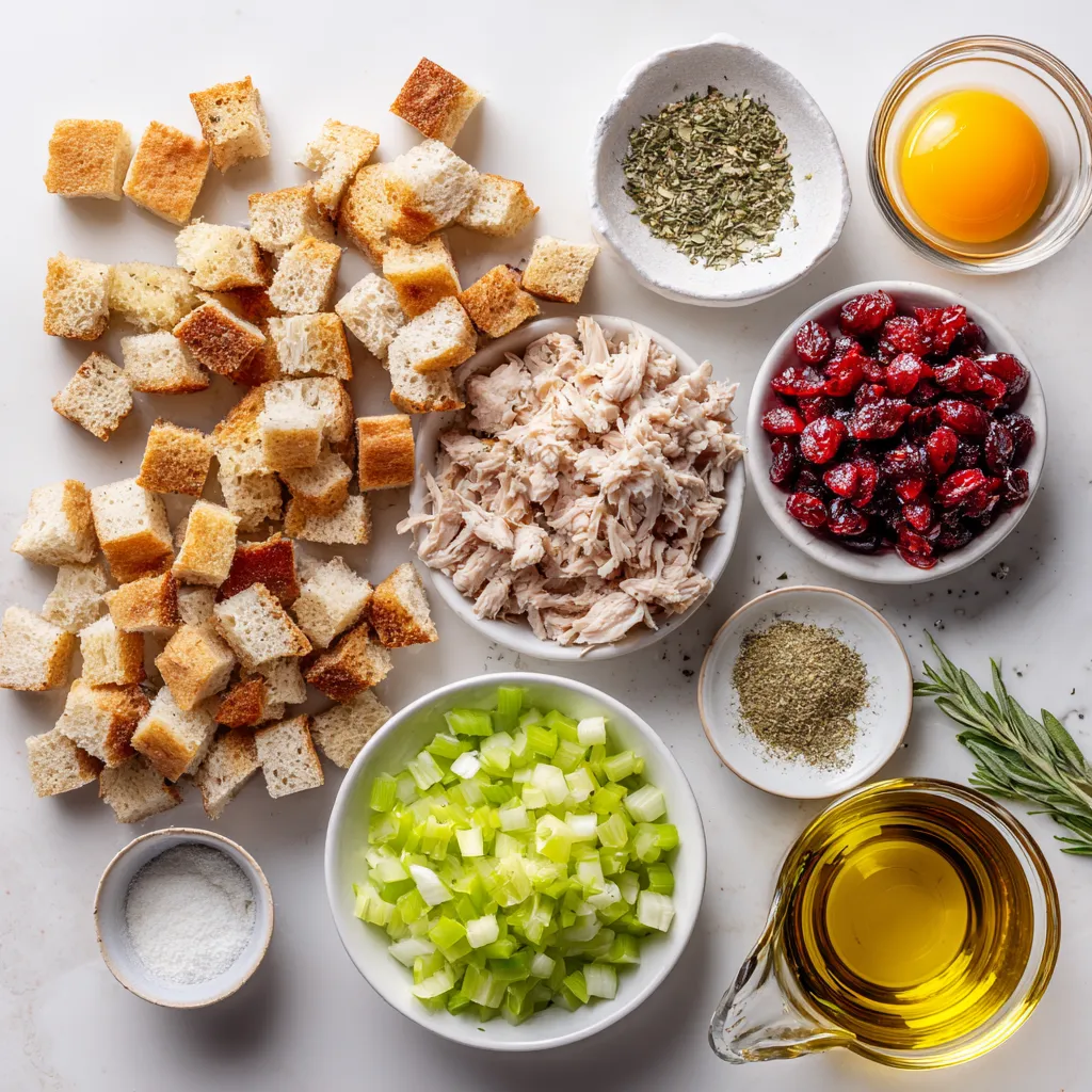 • In a large mixing bowl, combine the cubed stale bread, shredded turkey, chopped dried cranberries, finely chopped celery, and minced onion. Mix well to distribute the ingredients evenly.