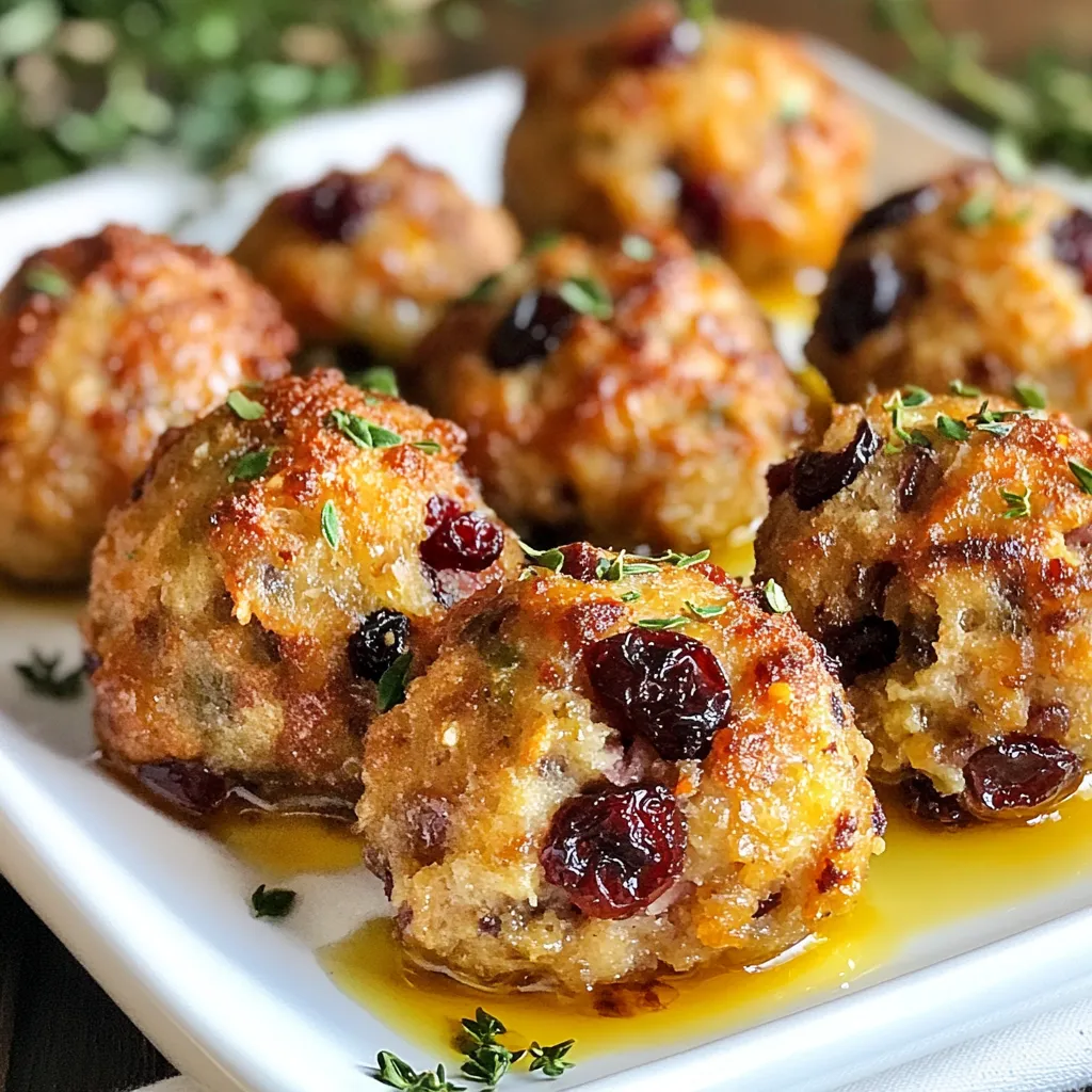 To make delicious cranberry turkey stuffing balls, you need just a few key ingredients: - 2 cups stale bread, cut into cubes - 1 cup cooked turkey, shredded - 1/2 cup dried cranberries, coarsely chopped - 1/4 cup celery, finely chopped - 1/4 cup onion, minced - 1/2 teaspoon dried sage - 1/2 teaspoon dried thyme - 1/4 teaspoon garlic powder - 1 egg, beaten - 1/4 cup chicken broth - Salt and freshly cracked pepper, to taste - 1 tablespoon olive oil (for drizzling) These ingredients work together to create a savory and slightly sweet flavor that everyone loves. When measuring ingredients, accuracy is important for the best results. Use dry measuring cups for the bread and cranberries. For the broth and egg, use liquid measuring cups. A kitchen scale can help if you prefer weight measurements. - Bread: 2 cups = about 6 ounces - Turkey: 1 cup = about 5 ounces - Dried cranberries: 1/2 cup = about 2.5 ounces - Celery: 1/4 cup = about 1 ounce - Onion: 1/4 cup = about 1 ounce - Herbs and spices: Measured in teaspoons for precision - Chicken broth: 1/4 cup = 2 ounces You can easily swap some ingredients if you have dietary needs or preferences. - For a gluten-free option, use gluten-free bread. - Substitute chicken broth with vegetable broth for a vegetarian option. - Use fresh herbs instead of dried for a bolder flavor. - Swap turkey with cooked chicken or even mashed beans for a meat-free version. These substitutions keep the spirit of the recipe while allowing for personal taste. {{ingredient_image_2}} First, you need to preheat your oven to 375°F (190°C). This step is key for even cooking. While it warms up, take a baking sheet and line it with parchment paper. This makes cleanup easy and helps prevent sticking. In a large mixing bowl, gather your main ingredients. Start with 2 cups of stale bread, cut into cubes. Next, add 1 cup of shredded cooked turkey. Then, toss in 1/2 cup of coarsely chopped dried cranberries. Also, include 1/4 cup of finely chopped celery and 1/4 cup of minced onion. Mix everything well to spread out the flavors evenly. Now, it’s time to add some herbs. Sprinkle in 1/2 teaspoon of dried sage, 1/2 teaspoon of dried thyme, and 1/4 teaspoon of garlic powder. Don’t forget a pinch of salt and freshly cracked pepper. Stir until all the herbs and spices blend into the mixture. In another bowl, whisk together 1 beaten egg and 1/4 cup of chicken broth. Pour this over your bread and turkey mix. Gently fold everything together until the bread is moist but not mushy. Using your hands, form small balls about 1.5 inches in diameter. Place them on the baking sheet, leaving space between each ball. Before baking, lightly drizzle the tops of the stuffing balls with 1 tablespoon of olive oil. This will help them brown nicely. Now, put the baking sheet in your oven and bake for 20-25 minutes. They are done when they turn golden brown and feel firm to the touch. Once baked, take them out and let them cool for a few minutes before serving. To boost flavor in your stuffing balls, use fresh herbs. Fresh sage and thyme add brightness. Dried herbs work too, but fresh gives more depth. Consider adding spices like paprika for warmth. A hint of cayenne can add a kick. You can also mix in zest from citrus. Lemon or orange zest brightens the dish. Lastly, don't skip the salt. It brings out all the other flavors. Texture is key for great stuffing balls. You want them crispy outside and moist inside. Start with stale bread for the best texture. Fresh bread can make the stuffing too soggy. When mixing, fold gently to avoid crushing the bread. This keeps some of the cubes intact. If the mixture feels too dry, add more broth. But don’t overdo it; you want them to hold shape when baked. Mixing should be thorough but gentle. Use your hands to combine ingredients. This helps you feel the texture and adjust moisture. When forming the balls, aim for about 1.5 inches in diameter. This size cooks evenly and is easy to handle. Keep them spaced on the baking sheet to allow for even browning. Lightly drizzle olive oil on top before baking. This helps achieve a golden, crispy crust. Pro Tips Use Fresh Herbs: Fresh herbs can enhance the flavor of your stuffing balls. If available, use fresh sage and thyme instead of dried for a more vibrant taste. Mix and Match Add-Ins: Feel free to customize your stuffing balls by adding other ingredients like nuts, diced apples, or sautéed mushrooms for extra texture and flavor. Moisture Control: Ensure the bread mixture is moist but not soggy. If the mixture seems dry, add a little more chicken broth until well combined. Perfect Baking: For an even bake, rotate the baking sheet halfway through cooking. This helps achieve a uniform golden-brown color on all sides. {{image_4}} You can make these stuffing balls vegetarian. Start by swapping the turkey for cooked mushrooms or lentils. Use vegetable broth instead of chicken broth. This keeps the flavor rich and hearty. You can also add in more vegetables like diced bell peppers or carrots. This adds color and nutrients. Herbs can change the taste of your stuffing balls. Try using rosemary or oregano instead of sage and thyme. These herbs add a new twist. You could also go for fresh herbs if you have them. Just remember, fresh herbs have a stronger flavor. Adjust the amount based on your taste. Adding nuts or cheese can make your stuffing balls even better. Chopped walnuts or pecans give a nice crunch. If you prefer cheese, try adding shredded cheddar or feta. Both options add great flavor and richness. Just mix them in with the other ingredients. You’ll enjoy the surprise in each bite! To keep your leftover stuffing balls fresh, place them in an airtight container. Layer them gently to avoid squishing. You can store them in the fridge for up to three days. If you want to keep them longer, freezing is a great option. When you're ready to enjoy the leftovers, preheat your oven to 350°F (175°C). Place the stuffing balls on a