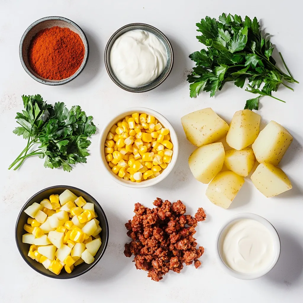 - 8 oz chorizo, casing removed and crumbled - 4 medium potatoes, peeled and diced into 1-inch cubes - 1 medium onion, finely diced - 2 cloves garlic, minced - 4 cups low-sodium chicken broth - 1 cup heavy cream - 1 cup corn kernels (can be fresh or frozen) - 1 teaspoon smoked paprika - Salt and pepper, to taste - 2 tablespoons extra virgin olive oil - Fresh parsley, chopped (for garnish) You can swap chorizo for turkey chorizo if you want leaner meat. For a vegetarian option, use mushrooms or tempeh. You can use vegetable broth instead of chicken broth if you need a meat-free base. If you're lactose intolerant, try coconut milk in place of heavy cream. The corn can be replaced with diced bell peppers or zucchini for a fresh twist. Look for chorizo that is bright red and feels firm. The potatoes should be smooth, with no spots or bruises. Choose onions that are heavy for their size and have dry, papery skin. Fresh garlic should be firm and not sprouted. For broth, pick low-sodium to control salt levels. Lastly, select cream that is rich and has no added ingredients. This makes your soup taste great! {{ingredient_image_2}} Start by heating 2 tablespoons of extra virgin olive oil in a large pot over medium heat. Once the oil is hot, add 8 ounces of crumbled chorizo. Cook the chorizo for about 5 to 7 minutes. Stir it often to get that nice golden color. The goal is to make it crispy. After it’s done, take it out of the pot. Leave the tasty drippings in the pot. This will add a lot of flavors to your soup. Next, add 1 medium diced onion and 2 cloves of minced garlic to the pot. Sauté them for about 4 to 5 minutes. You want the onion to get soft and clear. Keep stirring to avoid burning the garlic. This step fills your kitchen with a wonderful smell. It sets the base for the rest of your soup. Now, add 4 medium diced potatoes to the pot. Stir them around for 2 to 3 minutes. This helps the potatoes soak in the flavors. Then, pour in 4 cups of low-sodium chicken broth. Make sure the potatoes are fully covered. Bring the mix to a boil, then lower the heat to let it simmer for 15 to 20 minutes. You want the potatoes to be fork-tender. Next, use an immersion blender to blend half of the soup. This gives it a creamy texture while keeping some chunks for bite. If you don’t have an immersion blender, scoop out half into a regular blender, blend until smooth, and return it to the pot. Stir in 1 cup of heavy cream, 1 cup of corn kernels, and the reserved chorizo. Let it simmer for another 5 minutes. Before serving, taste and add salt and pepper as needed. This soup is all about the blend of flavors. Ladle it into bowls and garnish with fresh parsley. Enjoy the warmth and comfort of this delicious soup! To get that creamy texture, blend half of your soup. Use an immersion blender for ease. If you do not have one, a regular blender works too. Just remember to let it cool a bit before blending. This keeps the soup smooth while some chunks stay intact. After blending, stir in the heavy cream. It adds richness and a velvety feel. Not all potatoes cook the same way. Waxy potatoes, like red or new potatoes, cook faster. They become tender in about 15 minutes. Starchy potatoes, like russets, take longer. They may need an extra 5 minutes. Keep an eye on them. Check with a fork to see if they are tender. Adjust your cooking time based on the type you choose. To boost flavor, add smoked paprika. It gives a nice depth and warmth to your soup. You can also add a splash of lime juice for a bright kick. Fresh herbs, like thyme or cilantro, can bring freshness. If you enjoy spice, a pinch of cayenne pepper works wonders too. Each of these options can elevate your soup to new levels. Pro Tips Use Fresh Chorizo: For the best flavor, opt for fresh chorizo rather than pre-cooked varieties. The fresh chorizo will render more fat and flavor into the soup. Adjust the Creaminess: If you prefer a lighter soup, you can reduce the amount of heavy cream or substitute it with half-and-half or milk. Customize Your Potatoes: Feel free to use different types of potatoes, such as Yukon Gold or red potatoes, for varied texture and taste. Enhance the Flavor: Add additional spices like cayenne pepper or a splash of lime juice right before serving to elevate the flavor profile. {{image_4}} You can make a tasty vegetarian version of this soup. Instead of chorizo, use plant-based sausage or mushrooms. Both add a nice, earthy flavor. For a vegan option, swap heavy cream for coconut milk or cashew cream. These choices keep the soup rich and creamy. Use vegetable broth instead of chicken broth for a full veggie experience. If you like heat, add diced jalapeños or crushed red pepper flakes. These spicy additions give the soup a nice kick. You can also try adding a splash of hot sauce when serving. Just a little bit will wake up the flavors and warm you right up. You can change the soup with seasonal veggies. In spring, add fresh asparagus or peas for a bright touch. In fall, use sweet potatoes or butternut squash for a sweeter flavor. Each season brings new options. Mixing vegetables keeps the soup fresh and exciting every time you make it. To store your creamy chorizo potato soup, first let it cool down. Place the soup in a clean container. Make sure to seal it tightly. This helps keep the soup fresh and tasty. Store it in the fridge for up to 3 days. If you want to keep it longer, freezing is a great option. Freezing soup is simple and effective. Use an airtight container or a freezer-safe bag. Leave some space at the top. The soup will expand as it freezes. Label your container with the date. You can freeze it for up to 3 months. When you're ready to eat, just thaw it in the fridge overnight. To reheat, use a pot on medium heat. Stir the soup often to prevent sticking. You can also use a microwave. Place the soup in a microwave-safe bowl. Heat it in short bursts, stirring in between. This keeps the soup creamy and smooth. If it's too th