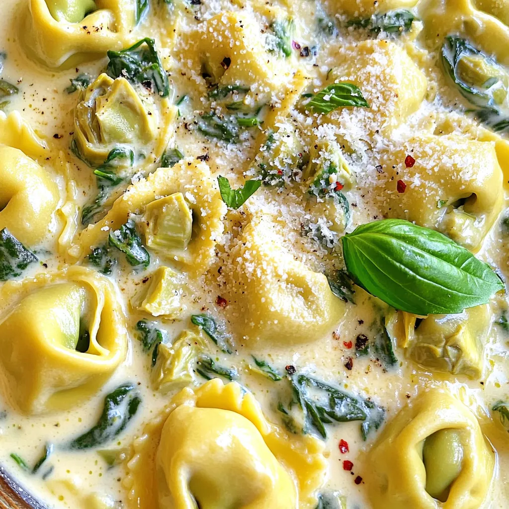 Fresh tortellini brings a delightful texture. You can use cheese-filled for rich flavor or spinach-filled for a vibrant twist. Frozen spinach is a great time-saver. Make sure to drain it well. Marinated artichokes add tang and depth. Cream cheese and heavy cream create the rich, creamy base. Parmesan cheese enhances the umami flavor.
