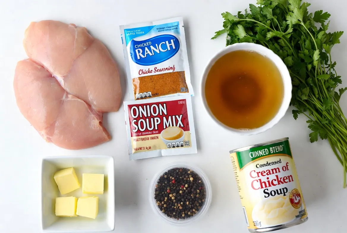 This recipe is simple and uses common ingredients. You start with chicken breasts, which provide the main protein. I love using low-sodium chicken broth. It adds flavor without too much salt. The ranch seasoning mix gives a nice tang, while onion soup mix adds depth.