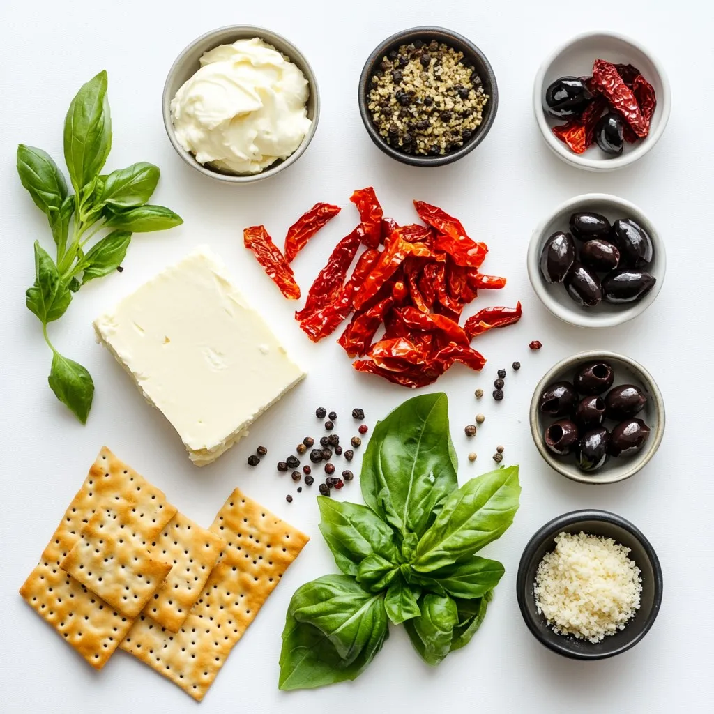 The main ingredients create a creamy base. The cream cheese gives a rich texture. Mozzarella adds a stretch. Parmesan gives a sharp taste. Sun-dried tomatoes bring sweetness. Black olives add saltiness. Roasted red peppers add a smoky flavor. Fresh basil brings brightness. Garlic powder and Italian seasoning round out the taste.