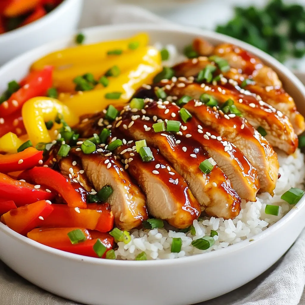 Now, let’s put it all together! Start with a base of cooked jasmine rice in each bowl. Next, add the sautéed bell peppers and onion for a burst of color. Then, place the grilled chicken strips on top of the veggies and rice. Drizzle a bit more honey BBQ sauce over everything to enhance the flavor. Lastly, for a fun touch, sprinkle chopped green onions and sesame seeds on top. Enjoy your delicious creation!