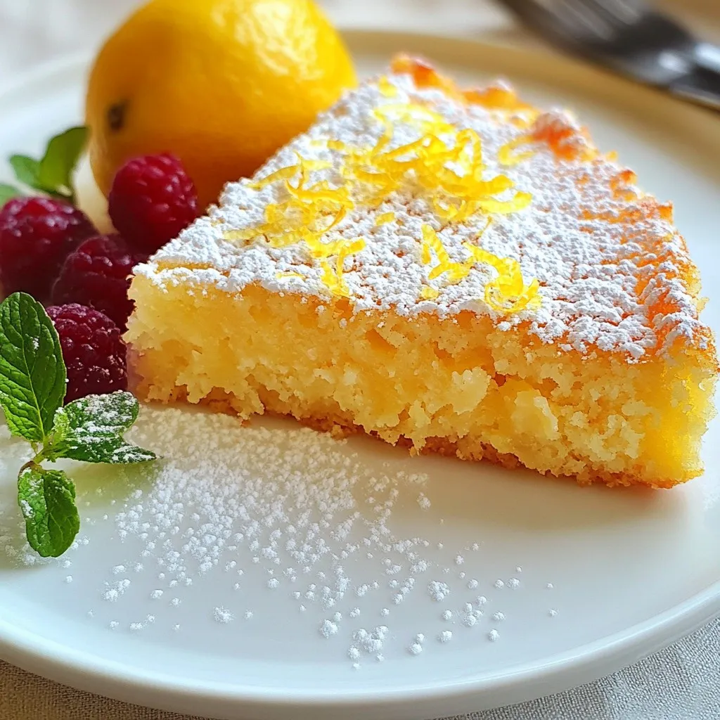 The key to a great Italian Lemon Custard Cake is in the ingredients. Each one plays a vital role in creating that delightful flavor. Here’s what you need: - 1 cup granulated sugar - 1/2 cup unsalted butter, softened to room temperature - 3 large eggs, at room temperature - Zest of 2 medium lemons - 1/4 cup freshly squeezed lemon juice - 1 1/2 cups whole milk, at room temperature - 1 cup all-purpose flour, sifted - 1 tablespoon baking powder - 1/4 teaspoon salt - Powdered sugar, for dusting When you gather these ingredients, you prepare to create a cake that’s moist and bursting with zest. The sugar sweetens, while the butter adds richness. Eggs create structure, and lemon juice gives that bright, tangy flavor. The milk keeps it tender, while flour and baking powder help it rise. Don't forget the powdered sugar! It adds a lovely finish and sweetness on top. Each ingredient works together to make your cake special. {{ingredient_image_2}} Start by setting your oven to 350°F (175°C). This temperature is key for baking. While the oven warms up, grab an 8-inch round cake pan. Use butter to grease the pan well. It helps the cake come out easily. Then, sprinkle a little flour in the pan. Tap it around until it coats the butter. This step makes sure your cake won't stick. In a large mixing bowl, place the softened butter and granulated sugar. Use an electric mixer at medium speed to mix them. Cream the butter and sugar for about 3-4 minutes. You want the mixture to be light and fluffy. This is important for creating a soft cake. The color should change to a pale yellow. Next, add the large eggs one at a time. Beat well after each egg. This helps make the mixture smooth. Now, it's time for the lemon. Stir in the lemon zest and fresh lemon juice. Make sure these flavors mix well. The zest adds a nice punch, while the juice gives it that fresh tang. This is where the cake gets its bright, zesty flavor. To bake a perfect Italian Lemon Custard Cake, follow the right temperature and timing. Preheat your oven to 350°F (175°C). This temperature helps the cake rise evenly. Bake the cake for 40-45 minutes. Check for doneness with a toothpick. If it comes out clean or with a few moist crumbs, your cake is ready. Mixing techniques are key to a light cake. Start by creaming the butter and sugar well until fluffy. Add eggs one by one, mixing after each. When you combine wet and dry ingredients, stir gently. Overmixing can make the cake dense. Stop mixing as soon as you see no dry flour; some lumps are okay. Presentation makes your cake special. Slice the cake into wedges. Serve with fresh berries on each plate. Strawberries and blueberries work well. Add a sprig of mint for a pop of color. Dust the top with powdered sugar for a sweet finish. This makes any gathering feel fancy! Pro Tips Room Temperature Ingredients: Ensure all your ingredients, especially eggs and milk, are at room temperature before mixing. This helps create a smoother batter and better texture in the final cake. Proper Measuring: Use the spoon-and-level method for measuring flour to avoid compacting it, which can lead to a dense cake. Spoon flour into your measuring cup and level it off with a knife for accuracy. Cooling Time: Allow the cake to cool in the pan for just 10 minutes, as overcooling can lead to moisture loss. Transferring to a wire rack helps it cool evenly without becoming soggy. Flavor Boost: For an extra lemony flavor, consider adding a teaspoon of lemon extract to the batter. This enhances the cake's citrus notes and makes it even more delightful. {{image_4}} You can play with flavors in your Italian lemon custard cake. Try using other citrus fruits like oranges or limes. They bring a nice twist. Adding herbs like basil or mint also adds a fun taste. Just chop them finely and mix them in with the lemon zest. This makes each bite exciting and fresh. If you need gluten-free options, use almond flour instead of all-purpose flour. It gives a lovely nutty flavor and works well in this recipe. For a dairy-free cake, swap the whole milk with almond milk or coconut milk. Both options keep the cake moist and tasty. Make sure to use dairy-free butter too. Serve your cake with a drizzle of lemon sauce for extra zest. A raspberry sauce can add a sweet touch. You can also top each slice with fresh berries and a sprig of mint. This not only adds color but also enhances the flavor. Enjoy experimenting with toppings to make each serving special! To keep your Italian Lemon Custard Cake fresh, store it properly. First, let the cake cool completely. Then, wrap it tightly in plastic wrap or place it in an airtight container. This keeps moisture in and prevents it from drying out. If you have more than one layer, place parchment paper between them. This avoids sticking. Store the cake at room temperature for short-term use, but if you want it to last longer, keep it in the fridge. Freezing your cake is a great way to enjoy it later. First, let the cake cool completely. Then, slice it into individual pieces. Wrap each slice tightly in plastic wrap. Place the wrapped slices in a freezer-safe bag or container. Label the bag with the date. When you're ready to enjoy a slice, take it out and thaw it in the fridge overnight. For a quick option, you can leave it at room temperature for an hour before serving. The Italian Lemon Custard Cake can last for about 3-5 days in the fridge. Make sure it is well-wrapped to maintain freshness. If you freeze it, the cake can last up to 3 months. Just remember, the longer it stays in the freezer, the more it may lose flavor and texture. Always check for any signs of freezer burn before eating. Enjoy your cake at its best! Italian Lemon Custard Cake is a bright, creamy dessert. It has a soft, moist texture and a rich lemon flavor. The cake combines sweet and tart, making each bite a delight. You get a lovely balance from the lemon juice and zest, which adds freshness. This cake has a custardy center that mel