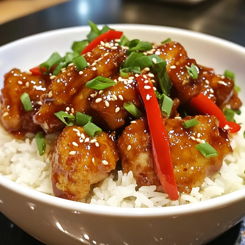 - 1 lb boneless chicken thighs - 2 tablespoons cornstarch - 2 tablespoons vegetable oil - 3 green onions - 2 cloves garlic - 1 tablespoon fresh ginger - 1/4 cup soy sauce - 1/4 cup brown sugar - 1 tablespoon rice vinegar - 1 teaspoon sesame oil - 1 red bell pepper - Sesame seeds for garnish - Salt and pepper to taste Let’s dive into the key ingredients for this tasty dish. First, I choose boneless chicken thighs because they stay juicy and tender when cooked. I cut them into bite-sized pieces for even cooking. Next, cornstarch is my secret weapon. It helps create a nice crispy texture on the chicken. I use vegetable oil to fry the chicken. This oil has a high smoke point and works well for stir-frying. Green onions add a fresh touch. I chop them and separate the white parts from the green. The white parts go in the pan first for sautéing. I also include garlic and fresh ginger. They bring a lot of flavor and make the dish smell amazing. For the sauce, I mix soy sauce, brown sugar, rice vinegar, and sesame oil. The soy sauce gives saltiness, while brown sugar adds a sweet touch. Rice vinegar brightens the taste, and sesame oil gives a nutty flavor. I slice a red bell pepper for color and crunch. Finally, I sprinkle sesame seeds on top for a nice finish. Don't forget salt and pepper to taste! These ingredients come together to create a delicious meal that’s easy to make. Enjoy cooking! {{ingredient_image_2}} Start by tossing the chicken with cornstarch. Use a medium bowl for this. Add a pinch of salt and black pepper too. This step is key for a crispy texture. Make sure every piece is coated well. The cornstarch helps the chicken turn golden and crunchy when cooked. Next, heat the vegetable oil in a large skillet over medium-high heat. Once the oil shimmers, add the chicken pieces in one layer. Cook for about 5-7 minutes. Turn the chicken so it browns on all sides. Once it’s golden, remove the chicken from the skillet. Set it aside on a plate to keep it warm. In the same skillet, lower the heat to medium. Add the white parts of the green onions, garlic, and ginger. Sauté this mixture for about one minute. It should smell amazing and the garlic should turn lightly golden. Then, pour in the soy sauce, brown sugar, rice vinegar, and sesame oil. Stir well and let it simmer. The sugar needs to dissolve completely for great flavor. Now, add the sliced red bell pepper into the skillet. Return the cooked chicken to the pan. Stir everything together so the chicken gets coated in the sauce. Cook for another 2-3 minutes until the chicken is hot and the veggies are a bit tender. Taste the dish and adjust the seasoning if needed. Finish by sprinkling sesame seeds and the green parts of the green onions on top. This adds a nice touch to your dish. Cornstarch is key for crispy chicken. It forms a nice crust when you fry it. Toss the chicken pieces in cornstarch before cooking. This step makes a big difference in texture. The cooking temperature matters too. Use medium-high heat to get that golden brown color. If the heat is too low, the chicken will not crisp up. Watch the oil; it should shimmer before adding chicken. Always use fresh ingredients for the best taste. Fresh garlic and ginger add a bright zing. Green onions also enhance flavor. You can use the whites for cooking and the greens for garnish. Consider adding more seasoning. A pinch of red pepper flakes gives a nice kick. You can also add a splash of lemon juice for brightness. Serve Mongolian Chicken over fluffy jasmine rice. The rice absorbs the sauce well and adds texture. For visual appeal, garnish with sesame seeds and green onion tops. This adds color and makes the dish pop. A well-presented dish is always more inviting! Pro Tips Perfectly Crispy Chicken: Ensure that the chicken pieces are thoroughly coated with cornstarch for a crispy texture. Avoid overcrowding the skillet to allow even cooking. Flavor Boost: For an extra depth of flavor, consider marinating the chicken in soy sauce and ginger for 30 minutes before cooking. Vegetable Variations: Feel free to add other vegetables such as broccoli or snap peas for more color and nutrition. Just adjust the cooking time accordingly. Serving Suggestions: Serve the dish over jasmine rice or noodles, and top with fresh cilantro or basil for an aromatic finish. {{image_4}} You can switch chicken for beef or tofu. Beef brings a rich taste. Use tender cuts like sirloin or flank steak. If you want a vegetarian dish, tofu is an excellent choice. Firm tofu holds up well in cooking. Just make sure to press it to remove excess water before cooking. You can add different vegetables to your Mongolian chicken. Broccoli, snap peas, or carrots add color and crunch. They also boost nutrition. You can also try spices like red pepper flakes for a kick. Adding hoisin sauce can enhance the sweetness too. Feel free to get creative with the flavors. Mongolian chicken works well in wraps. Use lettuce or tortillas for a fun meal. It’s also great over a fresh salad. This makes for a lighter dinner option. Top your salad with the chicken and some dressing. The warm chicken adds a nice touch to the crisp greens. To keep your Mongolian chicken fresh, use airtight containers. Glass containers work well, but plastic ones are fine too. Store the chicken in the fridge for up to three days. If you want to keep it longer, freeze it. Mongolian chicken can stay in the freezer for about three months. Just make sure to label the containers with the date. When reheating, try using a skillet. This method helps keep the chicken crispy. Heat the skillet over medium heat. Add a splash of water or broth to keep it moist. Stir the chicken often until it’s hot. You can also use a microwave if you are in a hurry. Place the chicken in a microwave-safe dish and cover it. Heat it in short bursts, stirring in between to maintain texture. To keep the flavor strong, add a pinch of soy sauce before reheating. Mongolian Chicken is a 