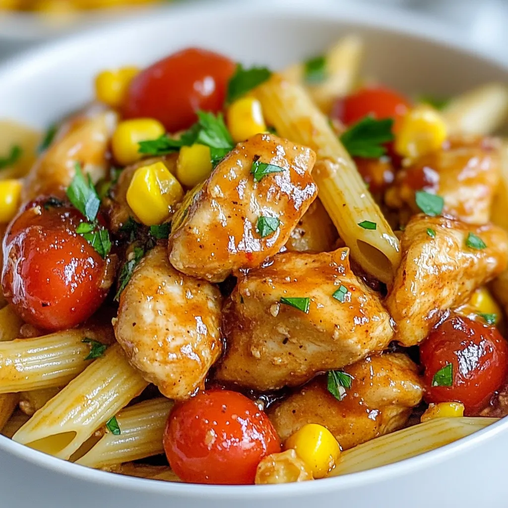 A delicious and easy one-pot pasta dish featuring chicken, BBQ sauce, honey, and vegetables.