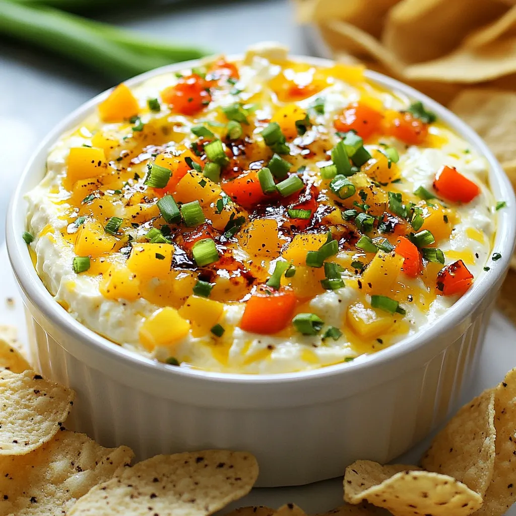 - 8 oz cream cheese, softened to room temperature - 1 cup sharp cheddar cheese, freshly shredded - 1/2 cup pepper jelly (choose mild or spicy based on your heat preference) - 1/2 cup mixed bell peppers, finely diced (red, yellow, and green for color) - 1/4 cup green onions, chopped - 1 teaspoon garlic powder - Salt and freshly cracked black pepper, to taste - Tortilla chips or assorted crackers for serving The key to my pepper jelly cheese dip is a mix of flavors. Cream cheese gives it a rich base, while sharp cheddar adds a bold taste. Pepper jelly brings the sweet and spicy elements together. I like to use a mix of bell peppers for a pop of color and crunch. Don't forget the green onions for a fresh kick! Garlic powder adds depth without overpowering the other flavors. You can adjust the salt and pepper to fit your taste. I suggest using fresh, cracked black pepper for the best flavor. Serve it with tortilla chips or assorted crackers. They make dipping easy and fun! {{ingredient_image_2}} To start, grab a medium-sized mixing bowl. Add 8 ounces of softened cream cheese. Then, add 1 cup of freshly shredded sharp cheddar cheese. Use a hand mixer or spatula to mix these two together. Blend until you get a creamy and smooth consistency. It’s key to mix well so your dip is nice and fluffy. Next, add 1/2 cup of pepper jelly to your cheese mixture. You can choose mild or spicy pepper jelly based on your taste. Blend the mixture until the pepper jelly is fully incorporated. This will bring a sweet and spicy flavor to your dip, making it truly special. Now it’s time to add some crunch. Fold in 1/2 cup of finely diced mixed bell peppers. You can use red, yellow, and green peppers for color. Next, add 1/4 cup of chopped green onions. These will give your dip a fresh taste. Season it with 1 teaspoon of garlic powder. Sprinkle in some salt and freshly cracked black pepper to taste. Adjust your seasonings to suit your flavor preference. Using different types of pepper jelly can change your dip's taste. Mild pepper jelly adds sweetness, while spicy jelly gives a kick. Try fruit-flavored jellies for a fun twist. You can use jalapeño jelly for extra heat or peach jelly for sweetness. Adjust the spice levels to fit your taste. Start with less jelly and add more as needed. This way, you can control how spicy your dip becomes. Garnishing your dip makes it look even better. Fresh herbs like cilantro or parsley add a bright touch. Just sprinkle some on top before serving. You can also arrange chips or crackers around the dip. This not only looks nice but also makes it easier for guests to grab a snack. Use colorful chips to make it pop. Serve the dip right after you make it for the best taste. If you can wait, refrigerate it for about an hour. This lets the flavors mix and grow stronger. Pair your dip with drinks like soda or light beer. It also goes well with other appetizers like veggie sticks or mini sliders. Enjoy sharing this tasty treat! Pro Tips Choose Your Heat Level: Select mild or spicy pepper jelly based on your tolerance for heat. This way, you can customize the dip to suit your guests' preferences. Experiment with Cheeses: Feel free to mix different cheeses like Monterey Jack or pepper jack for a unique flavor twist. This can add complexity and richness to your dip. Make Ahead: Prepare the dip a few hours in advance, or even the day before. This allows the flavors to meld together beautifully, enhancing the overall taste. Garnish for Appeal: Don’t skip the garnish! Fresh herbs like cilantro or parsley not only add color but also a fresh flavor that complements the dip perfectly. {{image_4}} You can mix different cheeses for unique flavors. Try using gouda or Monterey Jack. Combining these with sharp cheddar creates a rich taste. If you prefer something creamier, add soft cheeses like goat cheese or cream cheese. Goat cheese brings a tangy twist that balances well with the sweetness of pepper jelly. Want to spice things up? Add a few dashes of hot sauce to your dip. This extra heat enhances the flavor beautifully. You can also mix in vegetables for texture. Chopped olives or artichokes work well. They add depth and a touch of earthiness to the dip. Looking for a lighter version? Substitute low-fat cream cheese for regular cream cheese. This keeps the dip creamy while cutting calories. Pair the dip with veggie sticks instead of chips. Carrot, cucumber, or bell pepper sticks add crunch and color. They also make for a refreshing snack. The dip lasts up to 5 days in the fridge. To store leftovers, place the dip in an airtight container. This keeps the dip fresh and prevents it from absorbing other odors in the fridge. Always cover the top with plastic wrap if you don’t have a lid. Yes, the dip can be frozen. To freeze, place it in a freezer-safe container. Leave some space at the top for expansion. When you want to enjoy it again, move it to the fridge overnight to thaw. To reheat, place the dip in a microwave-safe bowl. Heat it in 30-second intervals, stirring between each interval. This method keeps the flavors intact. Avoid high heat to prevent separation or loss of texture. Enjoy the dip warm with chips or crackers! Yes, you can use store-bought pepper jelly. Store-bought options save time and still taste great. However, homemade pepper jelly allows you to control the flavor. You can adjust the sweetness and spice to your liking. If you can, try making your own. It can be a fun project and taste better. Yes, this dip is vegetarian-friendly. All the main ingredients, like cream cheese and cheddar cheese, are dairy-based. The pepper jelly is also plant-based. Just check the labels to ensure no animal products are in the brands you choose. This dip works well for various diets. To spice up the dip, add hot sauce or diced jalapeños. You can also use spicy pepper jelly. Mixing in crushed red pepper flakes is another option. Start with a little and taste as you go. Adjust until it meets your