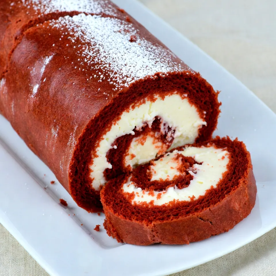 - 3 large eggs, at room temperature - 1 cup granulated sugar - 1 teaspoon pure vanilla extract - 1 tablespoon red food coloring - 2/3 cup all-purpose flour - 1/4 cup unsweetened cocoa powder - 1 teaspoon baking powder - 1/2 teaspoon baking soda - 1/4 teaspoon salt - Powdered sugar, for dusting - 8 oz cream cheese, softened to room temperature - 1/2 cup unsalted butter, softened to room temperature - 2 cups powdered sugar (for frosting) - 1 teaspoon vanilla extract (for frosting) When making a Red Velvet Cake Roll, use fresh ingredients. The eggs should be at room temperature. This helps them mix well and create a fluffy batter. The granulated sugar adds sweetness and helps with the texture. Be sure to use pure vanilla extract for the best flavor. Red food coloring gives the cake its signature look. Use a good quality brand for the best results. The all-purpose flour and cocoa powder help form the cake structure. Baking powder and baking soda work together to make your cake rise. Salt enhances all the flavors in the cake. For the filling, cream cheese adds a rich, tangy taste. Unsalted butter, also softened, gives the frosting a nice creaminess. Use powdered sugar to sweeten the filling and bring it all together. Don't forget the powdered sugar for dusting. This adds a lovely finish when you serve your cake roll. Gather these ingredients, and you are ready to create a delightful treat! {{ingredient_image_2}} - Set your oven to 350°F (175°C). - Line a 15x10-inch jelly roll pan with parchment paper. Make sure the paper hangs over the edges. This helps with easy removal later. - In a large bowl, beat 3 large eggs and 1 cup of granulated sugar with an electric mixer. Mix until light and fluffy, about 2-3 minutes. - Add 1 teaspoon of pure vanilla extract and 1 tablespoon of red food coloring. Mix until the color is bright and well blended. - In another bowl, whisk together 2/3 cup of all-purpose flour, 1/4 cup of unsweetened cocoa powder, 1 teaspoon of baking powder, 1/2 teaspoon of baking soda, and 1/4 teaspoon of salt. - Gradually add the dry mix to the wet mix. Fold gently until the batter is smooth. - Pour the batter into the prepared jelly roll pan. Spread it evenly to the edges. - Bake for 12-15 minutes. Check with a toothpick. It should come out clean when done. - After baking, let the cake cool for about 10 minutes. Dust a clean kitchen towel with powdered sugar. Flip the cake onto the towel and peel off the parchment paper. - Roll the cake up from the short side using the towel. This helps keep its shape. Let it cool completely while rolled. - In a mixing bowl, beat 8 oz of softened cream cheese with 1/2 cup of softened butter. Mix until smooth. - Gradually add 2 cups of powdered sugar and 1 teaspoon of vanilla extract. Beat until the filling is fluffy and well combined. - Once the cake is cool, unroll it gently from the towel. - Use an offset spatula to spread the cream cheese filling evenly over the cake. - Carefully roll the cake back up without the towel. Place it seam-side down on a serving platter. - Refrigerate the cake roll for at least 30 minutes to set. - Slice the roll into pieces and serve on dessert plates. Dust with more powdered sugar for an elegant touch. - Store leftover cake roll in an airtight container. - Keep it in the fridge for up to 4 days. - If you want to freeze it, wrap it well in plastic wrap and foil. - Thaw in the fridge overnight before serving. - To prevent cracks, don’t skip cooling the cake in a towel. - Roll the cake tightly but gently. - Roll it from the short side for a better shape. - If it cracks, don’t worry! Just cover it with frosting. - To adjust sweetness, add less powdered sugar to the cream cheese filling. - For flavor, mix in lemon zest or almond extract for a twist. - You can also stir in mini chocolate chips for a fun surprise. - Experiment with different cream cheese flavors, like strawberry or vanilla. Pro Tips Use Room Temperature Ingredients: Ensure your eggs and butter are at room temperature for a smoother batter and better incorporation of ingredients. Don't Overmix: When combining the dry and wet ingredients, fold gently to avoid overdeveloping the gluten, which can lead to a dense cake. Dust with Powdered Sugar: Dusting the towel with powdered sugar prevents the cake from sticking and adds a sweet touch to the final presentation. Chill Before Serving: Allowing the cake roll to chill for at least 30 minutes helps the cream cheese filling set, making it easier to slice. {{image_4}} You can give your Red Velvet Cake Roll a fun twist. Adding citrus zest, like orange or lemon, brightens the flavor. It adds a fresh note that pairs well with cream cheese. You can also use flavored cream cheese. Think about strawberry or lemon cream cheese. These flavors can change the whole cake experience. If you need gluten-free options, use a gluten-free flour blend. Many brands work well for baking. You can also make this cake vegan. Use flax eggs instead of regular eggs. Replace the butter with coconut oil or a vegan butter. These swaps keep the cake tasty while meeting dietary needs. Presentation matters, especially for a cake roll. You can garnish it with fresh fruits. Berries or mint leaves add color and freshness. Another fun idea is to dust the cake with cocoa powder or powdered sugar. This gives it a lovely finish that makes it look special. You can keep your red velvet cake roll in the fridge for about 3 to 5 days. Make sure to place it in an airtight container. This keeps it moist and fresh. If you don't have a container, wrap it tightly in plastic wrap. Both methods work well. To freeze the cake roll, wrap it tightly in plastic wrap and then in foil. This keeps it safe from freezer burn. You can freeze it for up to 3 months. When you're ready to enjoy it, move the cake to the fridge. Let it thaw overnight for the best taste and texture. Check for signs of spoilage, like an off smell or mold. If you see either, it’s best to throw 