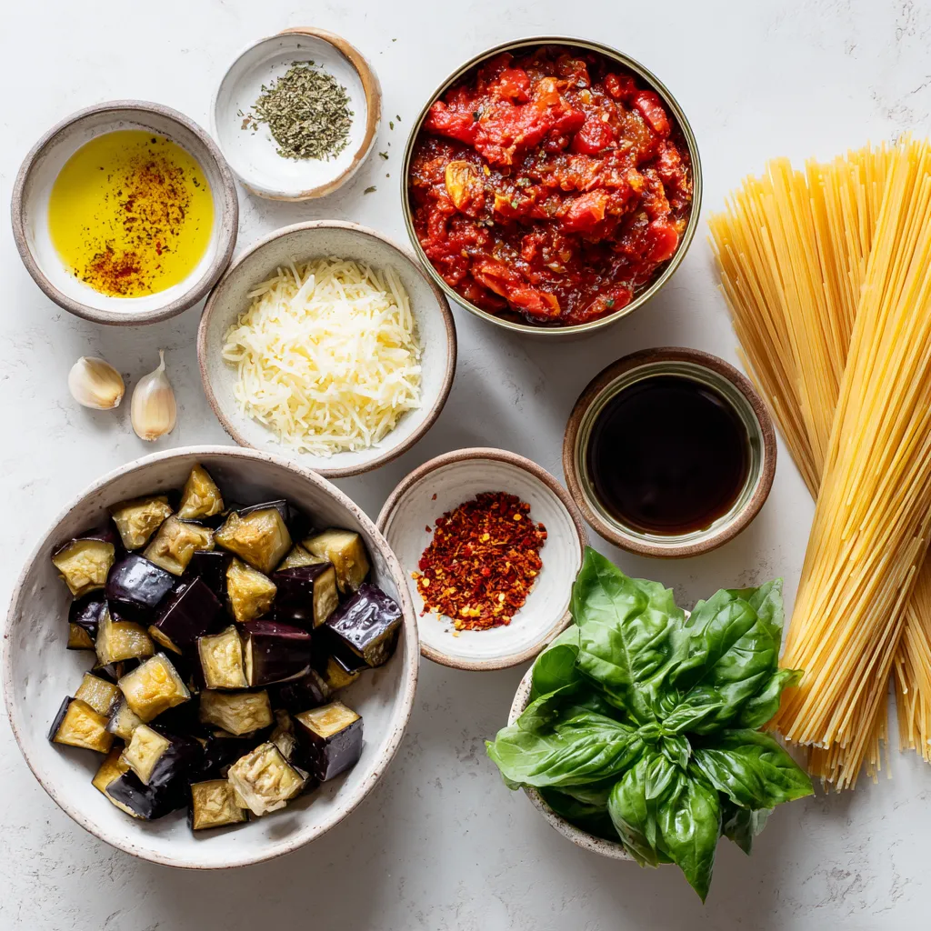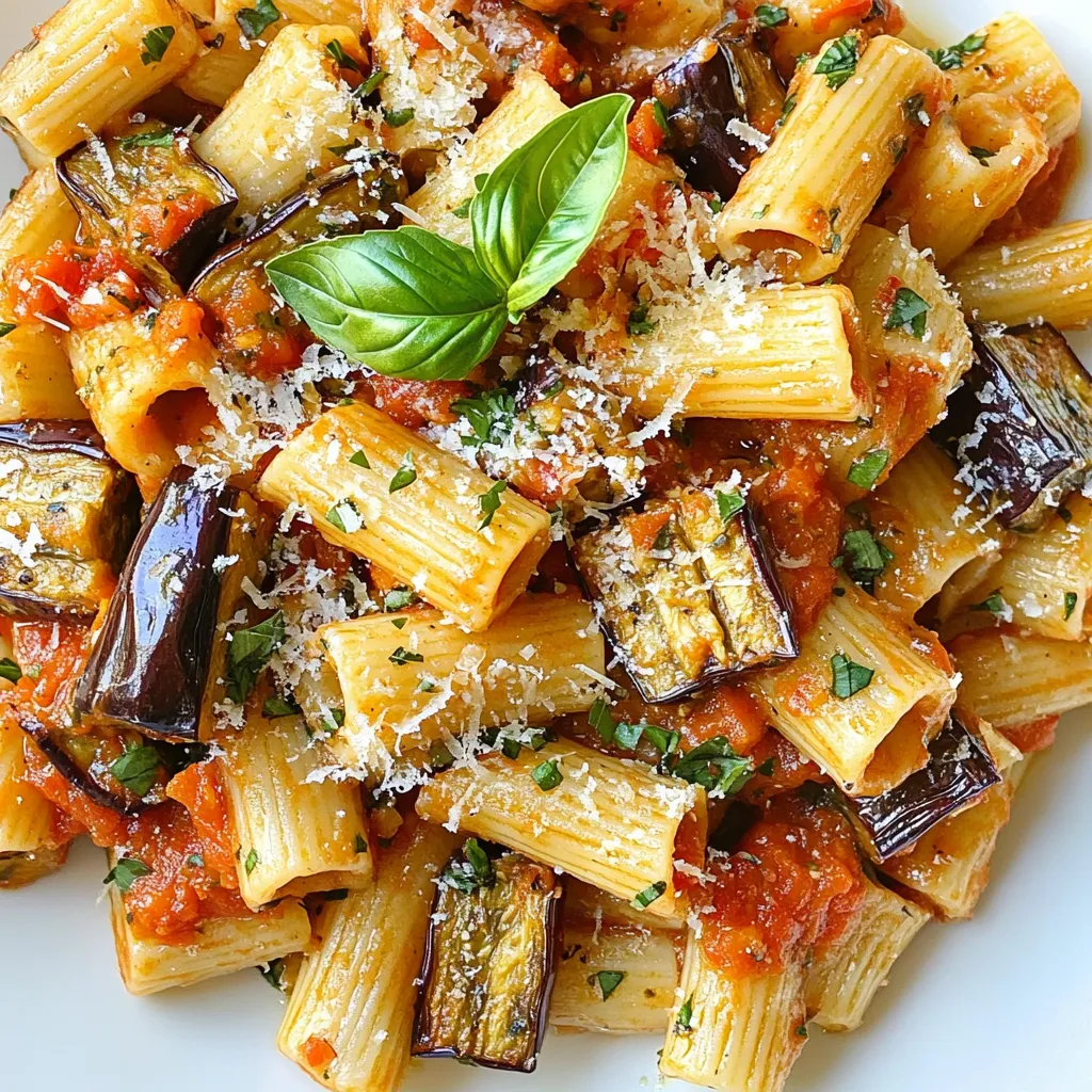 A delicious pasta dish featuring roasted eggplant, garlic, and a flavorful tomato sauce.