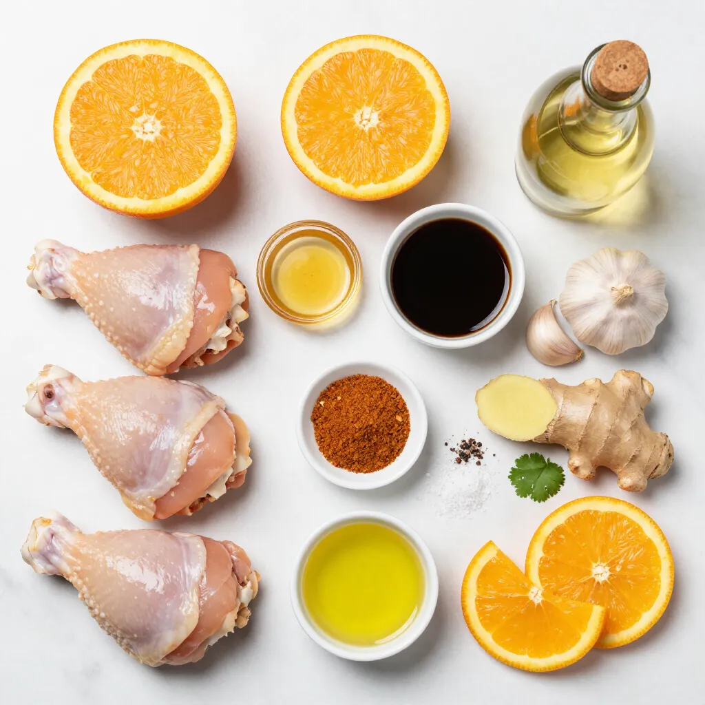 The ingredients for Sweet and Savory Roasted Orange Chicken come together beautifully. You need chicken thighs with skin and bone for the best flavor. The orange brings bright notes, while honey adds sweetness. Soy sauce gives a savory kick, and apple cider vinegar balances the dish.