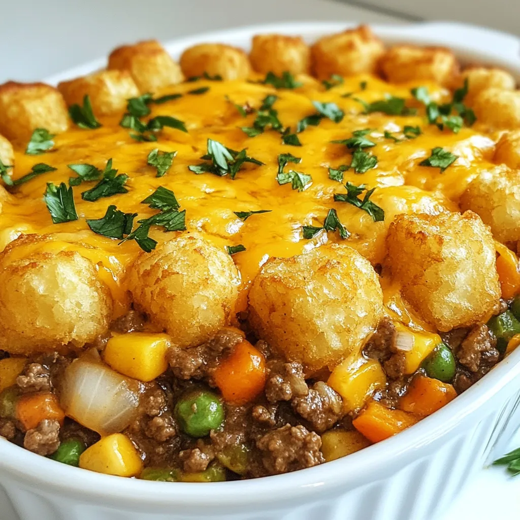 A hearty casserole featuring ground beef, mixed vegetables, and crispy tater tots topped with melted cheddar cheese.