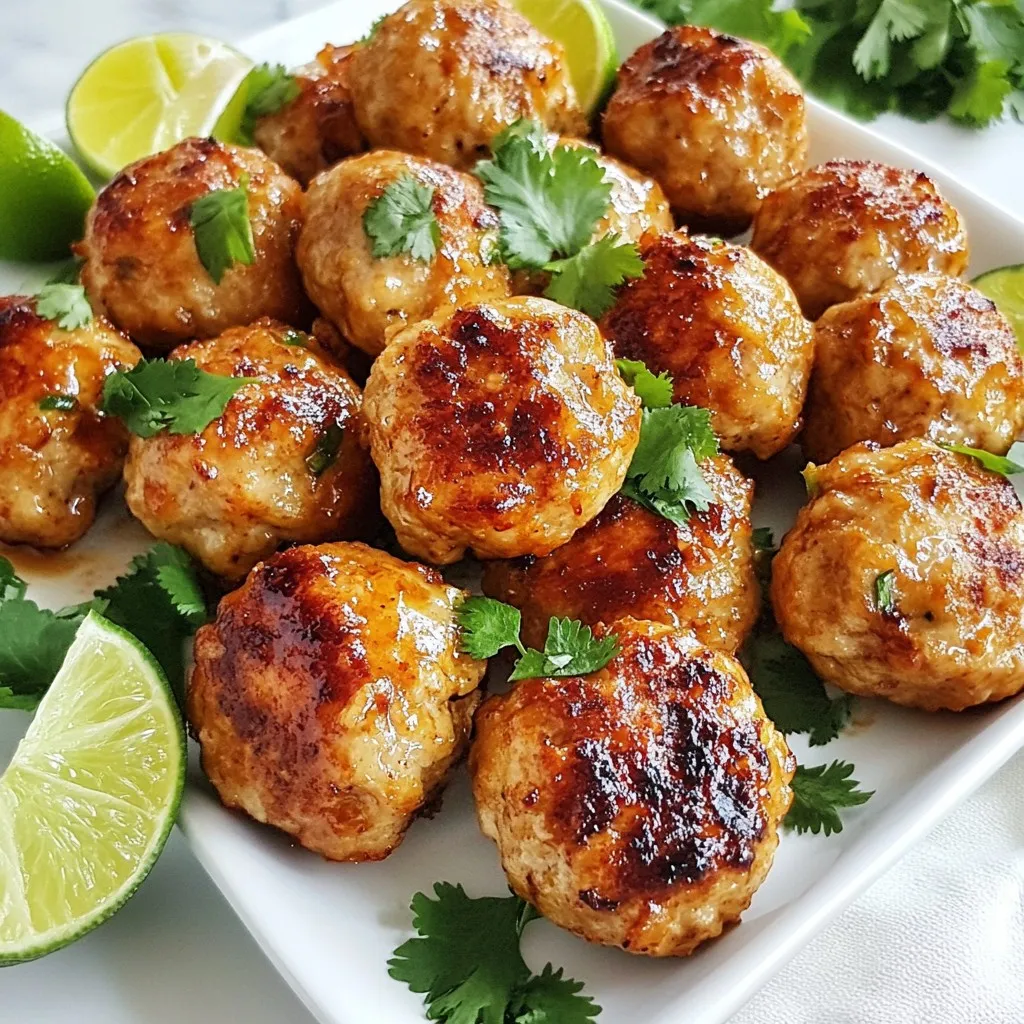 - 1 pound ground chicken - 1/2 cup breadcrumbs - 1/4 cup fresh cilantro, finely chopped - 2 green onions, thinly sliced - 2 cloves garlic, minced - 1 tablespoon fresh ginger, grated - 2 tablespoons Thai red curry paste - 1 tablespoon fish sauce - 1 tablespoon soy sauce - 1 egg, lightly beaten - 1 tablespoon lime juice - 1/2 teaspoon salt - 1/4 teaspoon black pepper - Cooking spray or olive oil, for greasing In this recipe, ground chicken acts as the main protein. It brings a light flavor that pairs well with fresh herbs and spices. I love using fresh cilantro and green onions for brightness. Garlic and ginger add depth, while Thai red curry paste gives the meatballs their signature kick. Fish sauce and soy sauce enhance the umami profile. An egg binds the mixture, keeping it moist. The lime juice adds a nice zing that cuts through the richness. - Substitute ground turkey or beef for chicken. - Use gluten-free breadcrumbs for a gluten-free option. - Consider a spicy dipping sauce made with sriracha and lime. - Try peanut sauce for a creamy twist. If you want to switch things up, you can use ground turkey or beef instead of chicken. If you need a gluten-free option, just use gluten-free breadcrumbs. For dipping sauces, sriracha mixed with lime juice adds heat. If you prefer creamy, a peanut sauce will take it to the next level. - Mixing bowl and spoons - Baking sheet - Measuring cups and spoons You will need a mixing bowl and some spoons to combine the ingredients. A baking sheet is essential for cooking the meatballs evenly. Make sure you have measuring cups and spoons to get the amounts just right. This will help ensure that your meatballs turn out perfectly every time. {{ingredient_image_2}} First, you need to preheat your oven to 400°F (200°C). This step helps to cook the meatballs evenly. While the oven heats up, grab a baking sheet. Line it with parchment paper. This keeps the meatballs from sticking. Lightly spray it with cooking spray or drizzle a bit of olive oil on top. This will give the meatballs a nice texture. In a big mixing bowl, it's time to bring it all together. Add the ground chicken, breadcrumbs, and fresh herbs. Toss in the cilantro, green onions, minced garlic, and grated ginger. Don’t forget the Thai red curry paste, fish sauce, soy sauce, beaten egg, lime juice, salt, and black pepper. Use your hands to mix everything gently. Make sure not to overmix. If you do, the meatballs can become hard. Now, you’ll shape the meatballs. With clean hands, take small bits of the mixture. Roll them into 1-inch balls. Place them on the baking sheet, leaving space between each one. This helps them cook properly. Once all the meatballs are on the sheet, give the tops a light spray of cooking spray. This helps them get that beautiful golden color. Bake the meatballs in your preheated oven for about 20 to 25 minutes. You will know they are ready when they turn golden brown and are fully cooked. For a crispy finish, switch the oven to broil. Broil the meatballs for 2 to 3 minutes. Keep a close eye on them to avoid burning! Finally, take them out and let them cool a bit before serving. To get tender meatballs, avoid overmixing. When you mix the chicken and other ingredients, do it gently. Overmixing makes the meatballs tough. Just combine until everything is mixed well. This keeps them soft and juicy. You can adjust the spices and heat levels to fit your taste. If you like more heat, add more Thai red curry paste. For a milder flavor, use less. You can also try adding fresh herbs like basil or mint for a different twist. Experiment and find your perfect flavor! Serving your meatballs well makes them more appealing. Arrange them on a nice plate. Add extra cilantro and lime wedges for a pop of color. A simple dipping sauce can elevate the dish. Mix soy sauce, lime juice, and honey for a tasty dip. It balances sweetness and saltiness, making each bite even better! Pro Tips Keep It Moist: Adding a splash of coconut milk to the meatball mixture can enhance moisture and flavor, giving your meatballs an authentic Thai taste. Use Fresh Ingredients: Whenever possible, opt for fresh herbs like cilantro and lime. They significantly boost the flavor profile of your meatballs. Experiment with Spices: Don't hesitate to adjust the level of Thai red curry paste based on your spice preference. Start with a smaller amount and add more to taste. Perfectly Cooked: To ensure your meatballs are cooked through without drying out, use a meat thermometer. Aim for an internal temperature of 165°F (74°C). {{image_4}} You can change up the protein in these meatballs. Try ground turkey or pork for a twist. If you want a plant-based option, use lentils or chickpeas. For a binding agent, swap breadcrumbs with cooked rice or oats. These changes keep the flavor fun and fresh. Serve your meatballs with a spicy peanut sauce for a tasty kick. You can also pair them with sweet chili sauce for a milder option. Fresh veggies like cucumber or carrots add crunch. Serve the meatballs on a bed of rice or noodles for a full meal. To make this dish gluten-free, use gluten-free breadcrumbs. You can also use tamari instead of soy sauce. If you like heat, add more Thai red curry paste or fresh chili. These simple swaps keep everyone happy at the table. To store meatballs for short-term use, let them cool first. Place cooked meatballs in an airtight container. You can keep them in the fridge for up to four days. If you want to reheat, just warm them in the oven or microwave until hot. Freezing is a great way to keep your meatballs fresh. To do this, let the meatballs cool completely. Then, arrange them in a single layer on a baking sheet. Freeze them for about an hour. Once frozen, place them in a freezer bag or container. They can last up to three months in the freezer. When you’re ready to eat, bake straight from the freezer. Just add a few extra minutes to the cook time. For best taste and safety, check your meatballs oft