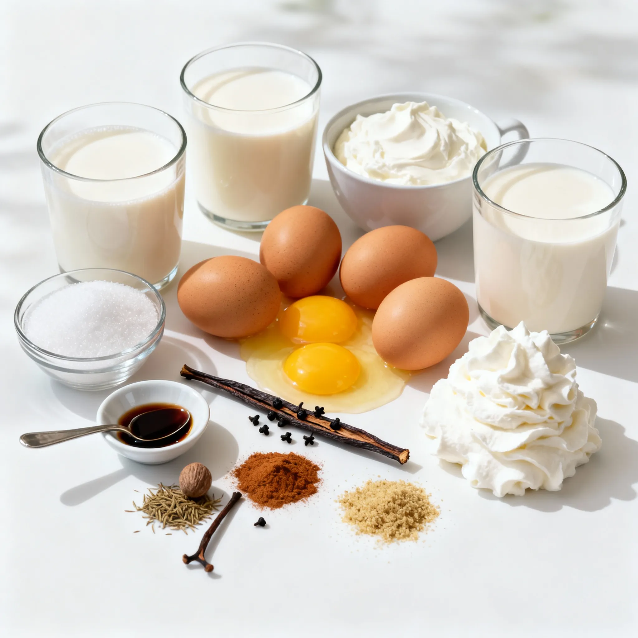 Start by gathering all your ingredients. You’ll need 4 cups of whole milk, 1 cup of heavy cream, and 3/4 cup of granulated sugar. Next, take 5 large eggs and crack them into a bowl. Also, grab a teaspoon of pure vanilla extract and 1 vanilla bean. Don’t forget 1/2 teaspoon of ground nutmeg and 1/4 teaspoon of ground cinnamon for flavor.