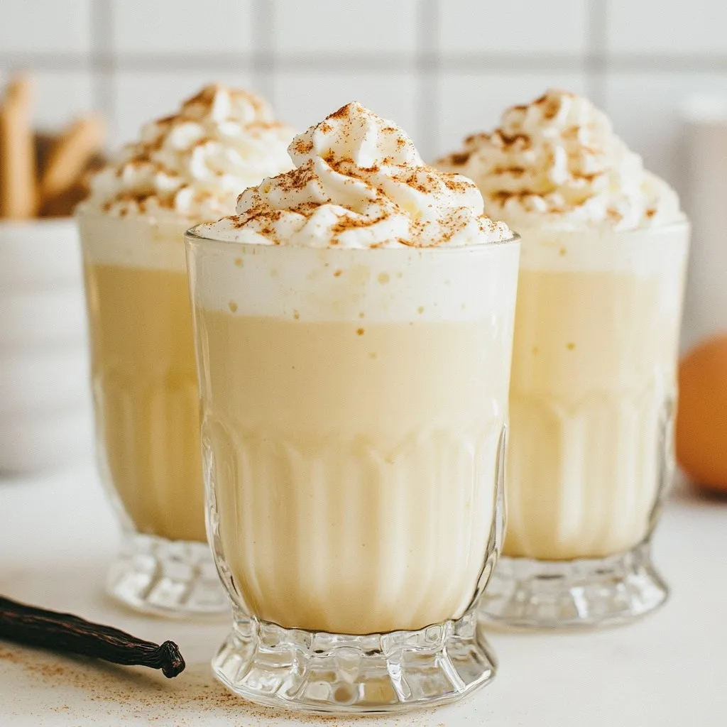 A creamy and festive eggnog recipe infused with vanilla bean and spices, perfect for holiday celebrations.