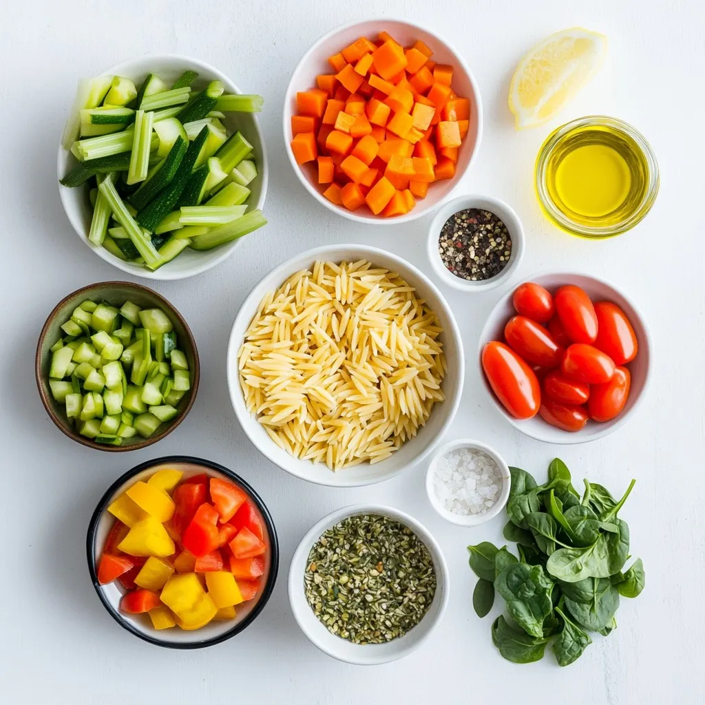 For this hearty vegetable orzo soup, gather these ingredients: