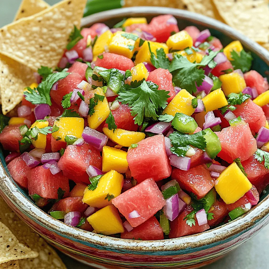 Watermelon fruit salsa is a fun and bright dish. Each ingredient adds its own flavor. The watermelon gives a sweet and juicy base. Mango adds more sweetness and a vibrant color.