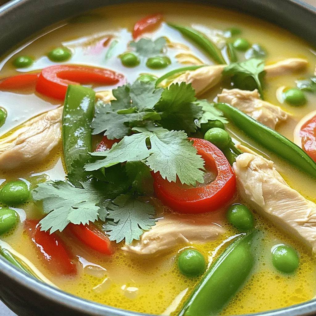 - 1 tablespoon coconut oil - 1 pound chicken breast, thinly sliced - 1 teaspoon fresh ginger, minced - 2 cloves garlic, minced To start your soup, coconut oil is key. It adds rich flavor and helps cook the chicken. Choose fresh chicken breast. Thinly slice it for quick cooking. Fresh ginger gives warmth, while garlic adds depth. - 2 tablespoons red curry paste - 1 tablespoon fish sauce - 1 tablespoon freshly squeezed lime juice Red curry paste brings heat and spice. It’s a staple in Thai cooking. Fish sauce adds umami, a savory taste. Lime juice brightens the soup. These flavors blend well and create a delicious base. - 1 red bell pepper, thinly sliced - 1 cup snap peas, trimmed - 2 green onions, thinly sliced For crunch, add red bell pepper and snap peas. They stay vibrant and crisp when cooked briefly. Green onions give a fresh finish. Use them as a garnish for color and flavor. 1. First, melt 1 tablespoon of coconut oil in a large pot over medium heat. Watch as the oil coats the bottom of the pot. 2. Next, add 1 pound of thinly sliced chicken breast. Sauté it for about 5 to 7 minutes. Stir often, cooking until the chicken is browned and no longer pink inside. 1. After the chicken is done, add 1 teaspoon of minced fresh ginger and 2 cloves of minced garlic. Stir them in for about 1 minute. You will smell their lovely aroma fill the air. 2. Now, mix in 2 tablespoons of red curry paste. Stir well so that every piece of chicken is coated with this vibrant paste. 1. Gradually pour in 4 cups of low-sodium chicken broth and 1 can of full-fat coconut milk. Stir to mix everything together. Bring the soup to a gentle simmer over medium heat. 2. Once it simmers, add 1 thinly sliced red bell pepper and 1 cup of trimmed snap peas. Cook for another 5 minutes. This will soften the vegetables but keep their bright colors. 3. Finally, stir in 1 tablespoon of fish sauce and 1 tablespoon of freshly squeezed lime juice. Taste and add salt and pepper as needed. 4. When ready, remove the pot from heat. Serve hot, topped with sliced green onions and fresh cilantro leaves for a tasty finish. Using thinly sliced chicken speeds up cooking time. It cooks evenly and quickly. This method helps you get a tender bite in every spoonful. Managing heat is also key. Keep the pot on medium heat for a quick simmer. This way, the soup bubbles gently, blending the flavors without boiling over. Adjusting the spice level can make your soup perfect for your taste. If you like it hot, add more red curry paste. For less heat, use less. Fish sauce adds depth to the soup. If you need an alternative, use soy sauce or tamari. Both provide a savory flavor without the fishy taste. Garnishing with fresh cilantro gives a bright touch to your dish. Just sprinkle it on top before serving. For serving, consider crusty bread or steamed rice. Both soak up the broth well. Plus, they make your meal feel complete and cozy. {{image_4}} You can switch up the protein in this soup. Shrimp is a great choice. It cooks quickly and adds a nice flavor. Just add it near the end, so it doesn’t overcook. Tofu is also a good option for a plant-based meal. Firm tofu absorbs all the flavors well. If you want chicken, try using thighs instead of breasts. Thighs stay juicy and tender. Feel free to change the veggies in your soup. Zucchini adds a nice texture. Slice it thin and toss it in with the other vegetables. Mushrooms bring an earthy flavor. You can use any kind, like shiitake or button. Leafy greens like spinach or bok choy work well too. Add them at the end to keep them bright and fresh. Want more heat? Modify the red curry paste amount. Add more if you enjoy spicy food. Start with a little, then taste as you go. You can also sprinkle in chili flakes for extra kick. Just a pinch can elevate the flavor. Always keep tasting to find the right balance for your palate. To store leftovers, let the soup cool first. Use an airtight container. This keeps the soup fresh. You can store it in the fridge for up to three days. When you are ready to eat, reheat the soup gently. Use a pot over low heat or the microwave. Stir it well to ensure even heating. If you want to freeze the soup, use freezer-safe containers. Leave some space at the top because soup expands when frozen. It is best to freeze it within a day or two of making it. To thaw, place the container in the fridge overnight. You can also use the microwave for quick thawing. Just be sure to stir it often. The soup lasts in the fridge for about three days. After that, it may spoil. Look for signs of spoilage, like a bad smell or mold. If it seems off, throw it away to stay safe. Enjoy your Weeknight Thai Chicken Soup fresh for the best taste! It takes about 30 minutes to make this soup. You spend 10 minutes prepping the ingredients. Then, you cook it for about 20 minutes. This quick time helps you enjoy a tasty meal on busy nights. Yes, you can make this soup ahead of time. Prepare the chicken, ginger, and garlic in advance. Store them in the fridge until you are ready to cook. You can also chop the bell pepper and snap peas early. Just add them when you are ready to finish the soup. This saves time and makes cooking easy. Yes, this soup can be gluten-free. Use gluten-free fish sauce and check the red curry paste. Most brands are gluten-free, but always read the label. The other ingredients, like chicken and vegetables, are naturally gluten-free. Enjoy this soup without worry! This blog post explored the key ingredients and steps needed to create a delicious weeknight Thai chicken soup. You learned about using coconut oil, chicken, and fresh spices to build flavor. We covered quick cooking tips, variations for different proteins, and how to store leftovers properly. In closing, this soup is a simple, tasty meal you can enjoy any night. Feel free to make it your own by adjusting flavors and veggies!